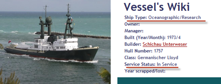 Σύμφωνα με τα όσα αναφέρονται στο Vessel’s WIki, το πλοίο είναι ερευνητικό/ωκεανογραφικό πλοίο και έχει τη κατασκευή Yacht. Αυτά τα χαρακτηριστικά δεν επιτρέπουν στο Λιμενικό να το χαρακτηρίσει σαν θαλαμηγό. Το πλοίο είναι ένα ωκεανογραφικό πλοίο και μάλιστα εν λειτουργία (in service). Άρα, πίσω απο τη συμπεριφορά του Λιμενικού υπάρχει κάτι άλλο ή κάποια ειδική διαταγή.