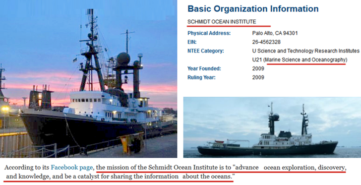 Σύμφωνα με το Business Insider (15 Feb. 2011) ο Schmidt αποφάσισε να γίνει ένας νέος Jacque Costeau. Tα τελευταία χρόνια αυτός και η γυναίκα του Wendy είχαν συγκεντρώσει κάπου 60 εκ, δολλάρια με σκοπό να τα χρησιμοποιήσουν σε “ωκεανογραφικές μελέτες” για το Schmidt Research Vessel Institute και το Marine Science and Technology Foundation. Για το σκοπό αυτό αγόρασαν δύο πλοία, το Lone Ranger (αυτό που είναι “γιώτ” κατα το ΓΕΕΘΑ και κάνει βόλτες στη Θάσο) και ένα άλλο το Falcon μήκους 83 μέτρων.