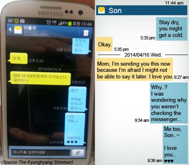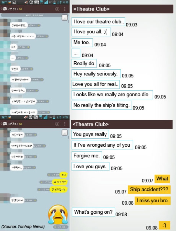 Σε ανταλλαγή μηνυμάτων ανάμεσα σε έναν επιβάτη με το όνομα Woong Gi και του αδερφού του, ο δεύτερος προσπαθεί να του παρέχει διαβεβαιώσεις πως τα σωστικά συνεργεία φτάνουν στο σημείο.
