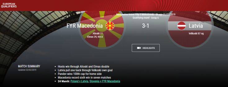 ΠΗΓΗ newsbeastΣτην επίσημη ιστοσελίδα της UEFA η εθνική ομάδα των γειτόνων αναγράφεται ακόμη ως FYR Macedonia, ενώ στην τηλεοπτική κάλυψη του ματς με αντίπαλο τη Λετονία, για τα προκριματικά του Euro 2020, παρουσιάστηκαν οι συνθέσεις των ομάδων σε καρτέλα που έφερε το σήμα της Ευρωπαϊκής Συνομοσπονδίας, μόνο με το όνομα «Μακεδονία».