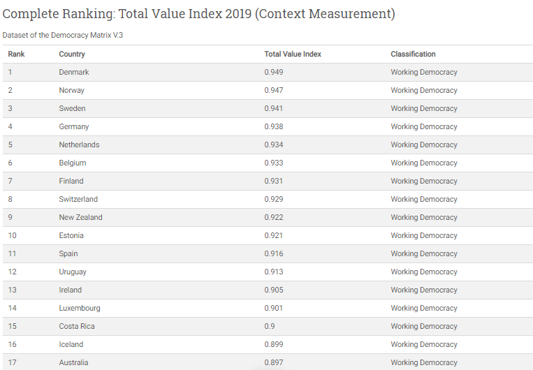 Η Δανία, η Νορβηγία και η Σουηδία ήταν οι κορυφαίες χώρες το 2019, ενώ η