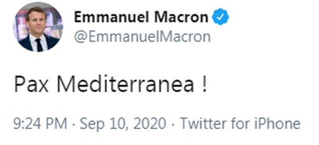 Ο Γάλλος πρόεδρος, αναφερόμενος στο όραμα για ένα «κοινό μεσογειακό πεπρωμένο», αντί «για ένα θέατρο συγκρούσεων και ηγεμονικών αντιπαραθέσεων», τόνισε ότι «η δική μας ευθύνη, ως κράτη μέλη της ΕΕ, είναι μια Μεσόγειος όπου θα υπάρχει μια πολιτική εποικοδομητική αντιμετώπιση, μια Pax Mediterranea, που θα επιτρέψει τις ανταλλαγές με αρμονικό τρόπο, ενώ ταυτόχρονα θα σεβόμαστε την κυριαρχία του κάθε κράτους μέλους».