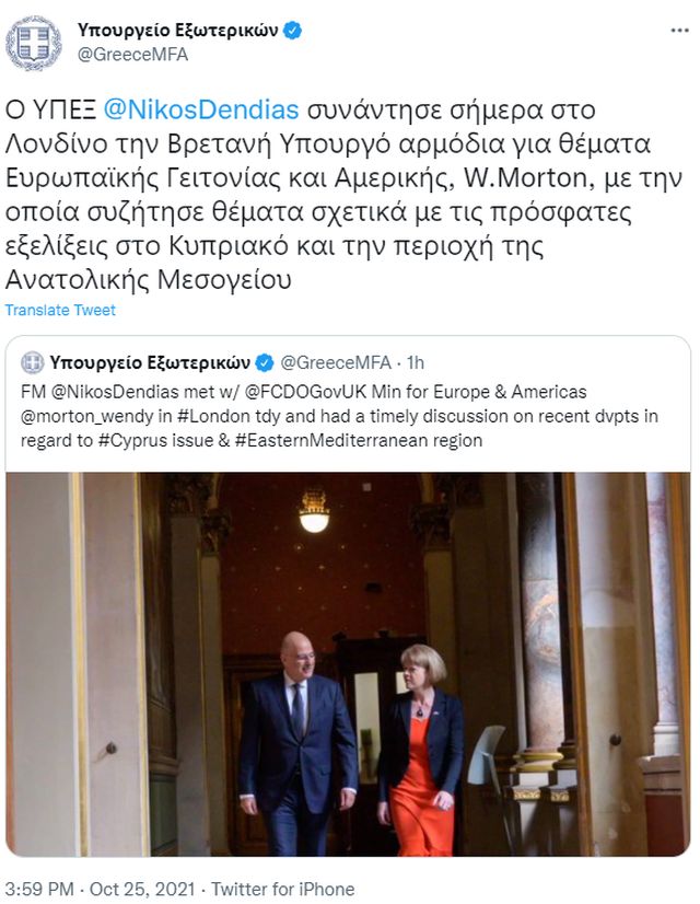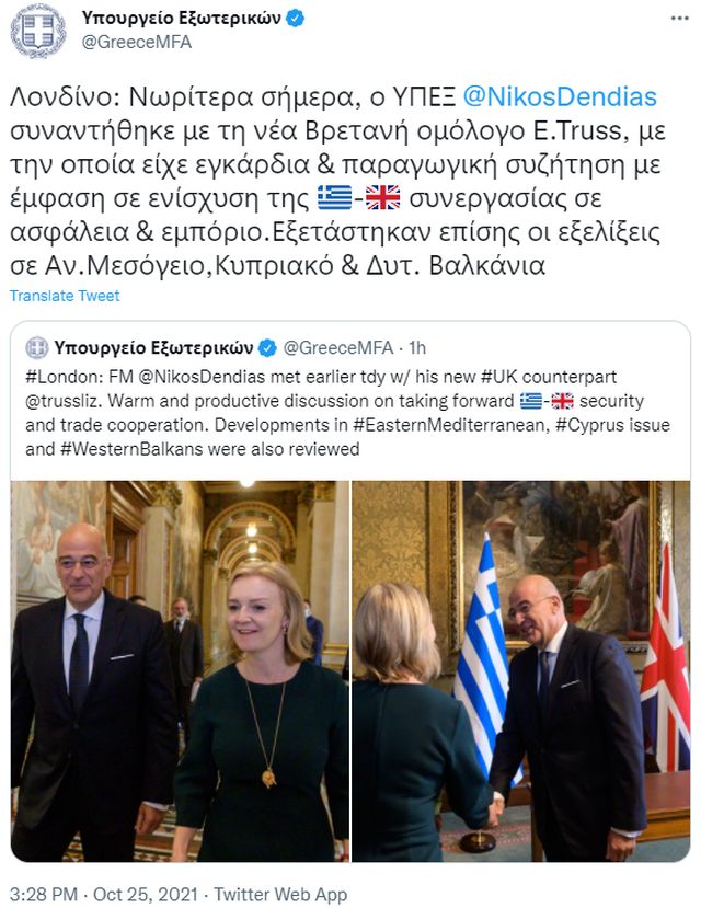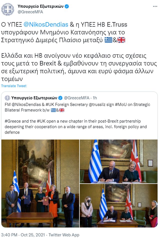 «Η υπουργός Εξωτερικών Λιζ Τρας συναντήθηκε σήμερα με τον Έλληνα ομόλογό της Νίκο Δένδια για να υπογράψει ένα νέο πλαίσιο για την ενίσχυση του εμπορίου, της ασφάλειας και της ψηφιακής συνεργασίας μεταξύ των δύο χωρών».