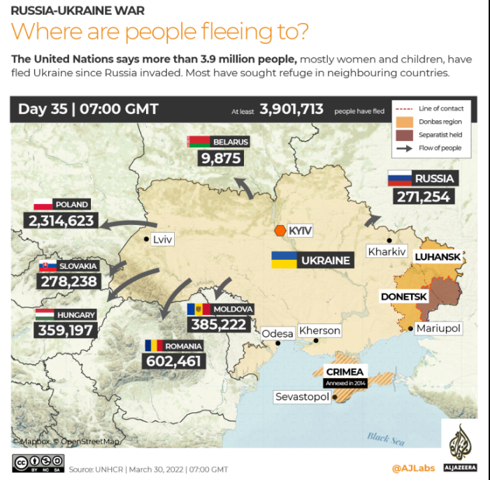 Παράλληλα, όπως φαίνεται από τον χάρτη των ΗΕ που ακολουθεί, πάνω από 3,9 εκατ. άνθρωποι, κυρίως γυναικόπαιδα, έχουν αναγκαστεί να αφήσουν τα σπίτια τους και τις πόλεις τους.