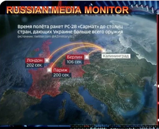 Σε εκπομπή στη ρωσική τηλεόραση παρουσιάστηκε μια «προσομοίωση» πυρηνικών χτυπημάτων με πυραύλους Sarmat, κατά την διάρκεια της οποίας προβλήθηκε γραφικό σύμφωνα με το οποίο ένας πύραυλος που θα εκτοξευθεί από το Καλίνινγκραντ, στη Βαλτική Θάλασσα, θα έχει φτάσει σε 106 δευτερόλεπτα στο Βερολίνο, σε 200 δευτερόλεπτα στο Παρίσι και σε 202 δευτερόλεπτα στο Λονδίνο.