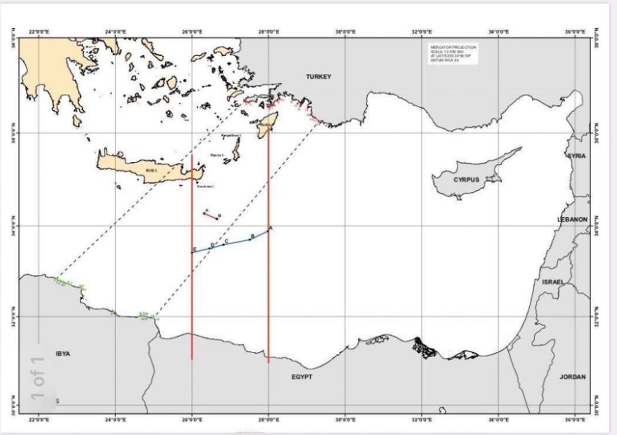 Στον παρακάτω χάρτη φαίνεται, πώς το παράνομο τουρκολιβυκό μνημόνιο εξαφανίζεται την ελληνική ΑΟΖ που οριοθετείται με κόκκινο χρώμα, νοτίως της Κρήτης και του Καστελόριζου και φθάνει έως το σημείο επαφής με την ΑΟΖ της Αιγύπτου. Η δήθεν χάραξη ΑΟΖ από την Τουρκία και τη Λιβύη, τέμνει την ελληνική ΑΟΖ και την εξαφανίζει, με ένα μέρος της να περνάει στην Τουρκία και ένα μέρος της να περνάει στην Λιβύη.
