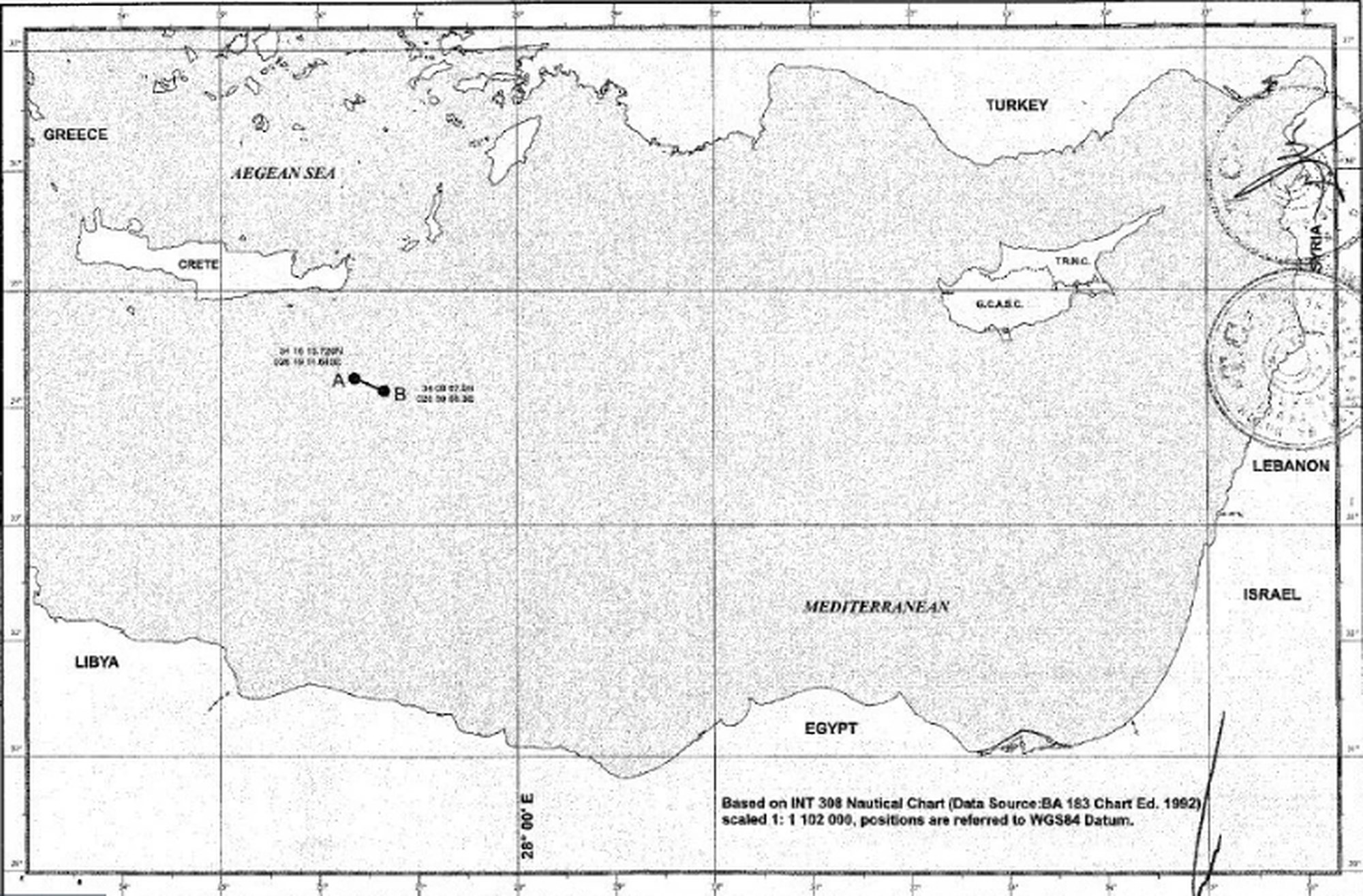 Η τουρκολιβυκή συμφωνία του 2019 περιελάμβανε ένα 5σέλιδο κείμενο, στο οποίο καθορίζονταν υποτίθεται η ΑΟΖ της Τουρκίας και της Λιβύης. Το κείμενο, γραμμένο σε τουρκικά, αραβικά και αγγλικά, οριοθετεί την υφαλοκρηπίδα/ΑΟΖ των δύο χωρών, η οποία περνάει δίπλα ακριβώς από ελληνικά νησιά, όπως η Ρόδος, η Κάρπαθος και η Κρήτη, στα οποία φυσικά δεν αναγνωρίζει κανένα δικαίωμα. Τα δυο σημεία στον χάρτη, το Α και το Β προσδιορίζουν υποτίθεται- αυτό προβλέπει η συμφωνία Τουρκίας και Λιβύης- το σημείο όπου εφάπτονται οι ΑΟΖ της Αγκυρας και της Τρίπολης.