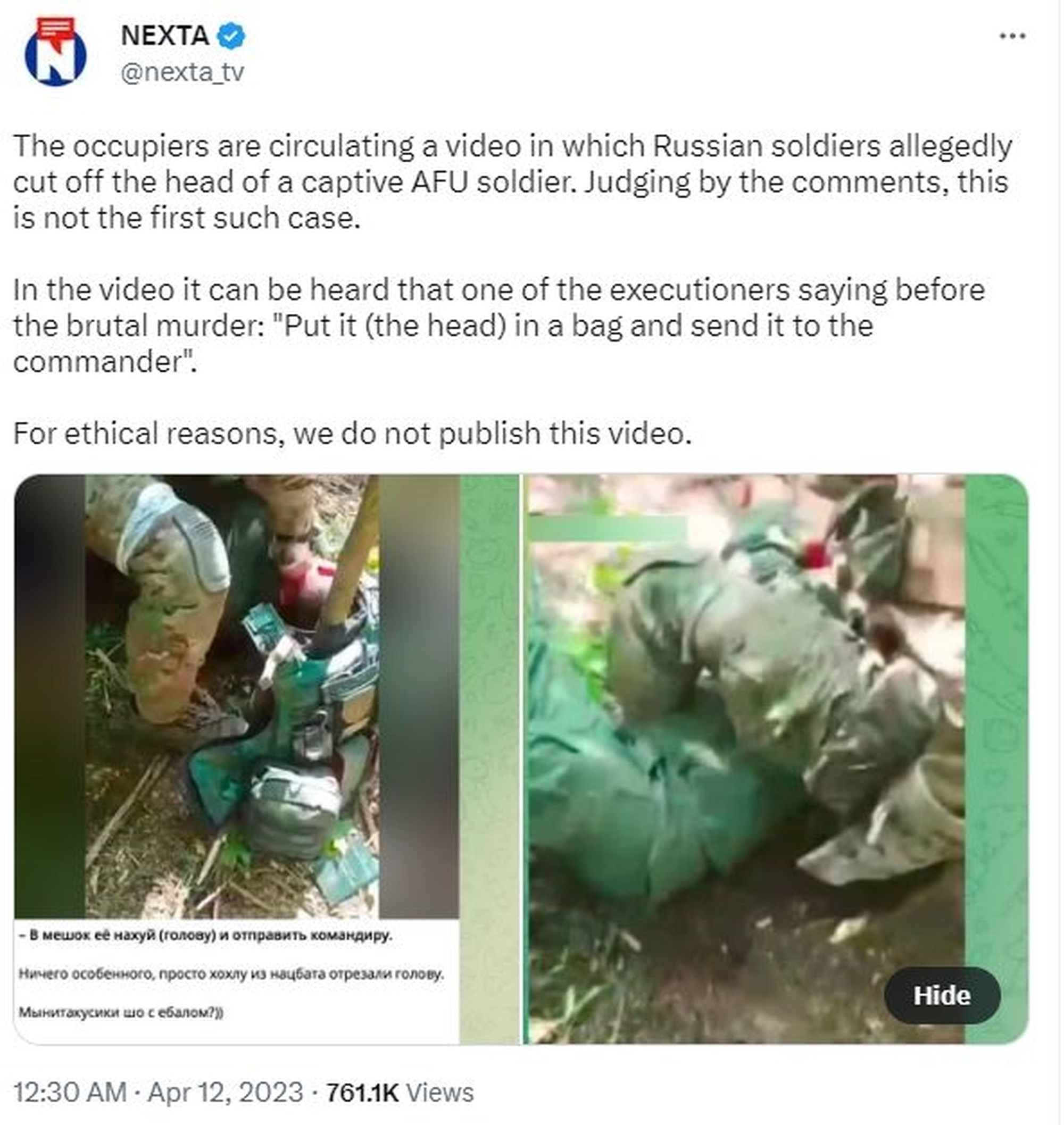 Οπτικό υλικό που φαίνεται να παρουσιάζει τον αποκεφαλισμό Ουκρανών στρατιωτών από Ρώσους, πιθανώς μισθοφόρους της ομάδας Wagner, προκαλεί τις τελευταίες ώρες αποτροπιασμό για τις φρικαλεότητες που διαπράττονται στον πόλεμο της Ρωσίας στην Ουκρανία.