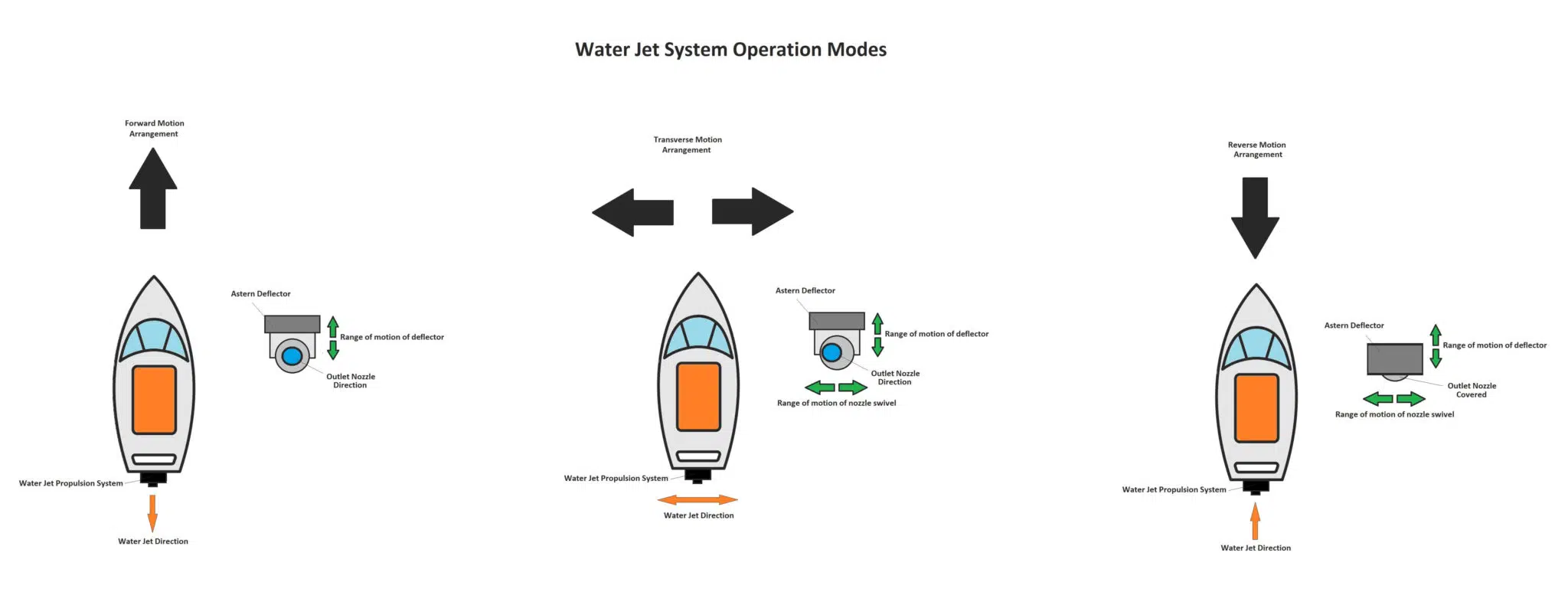 Τα συστήματα water jets τοποθετούνται στην πρύμνη του σκάφους , κοντά στην ίσαλο γραμμή. Το νερό αντλείται και επεξεργάζεται μέσα στο σύστημα για να βγει από το οπίσθιο ακροφύσιο με υψηλή ταχύτητα που ωθεί το σκάφος προς τα εμπρός. Το σύστημα εκτόξευσης νερού λειτουργεί με βάση την αρχή του Τρίτου Νόμου του Νεύτωνα που δηλώνει ότι κάθε δράση έχει μια ίση και αντίθετη αντίδραση. Η δύναμη που αναπτύσσεται λόγω της ταχείας εκτόξευσης νερού από το πίσω ακροφύσιο του συστήματος εκτόξευσης νερού δημιουργεί μια δύναμη αντίδρασης που ωθεί το σκάφος προς τα εμπρός.