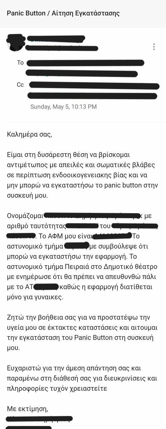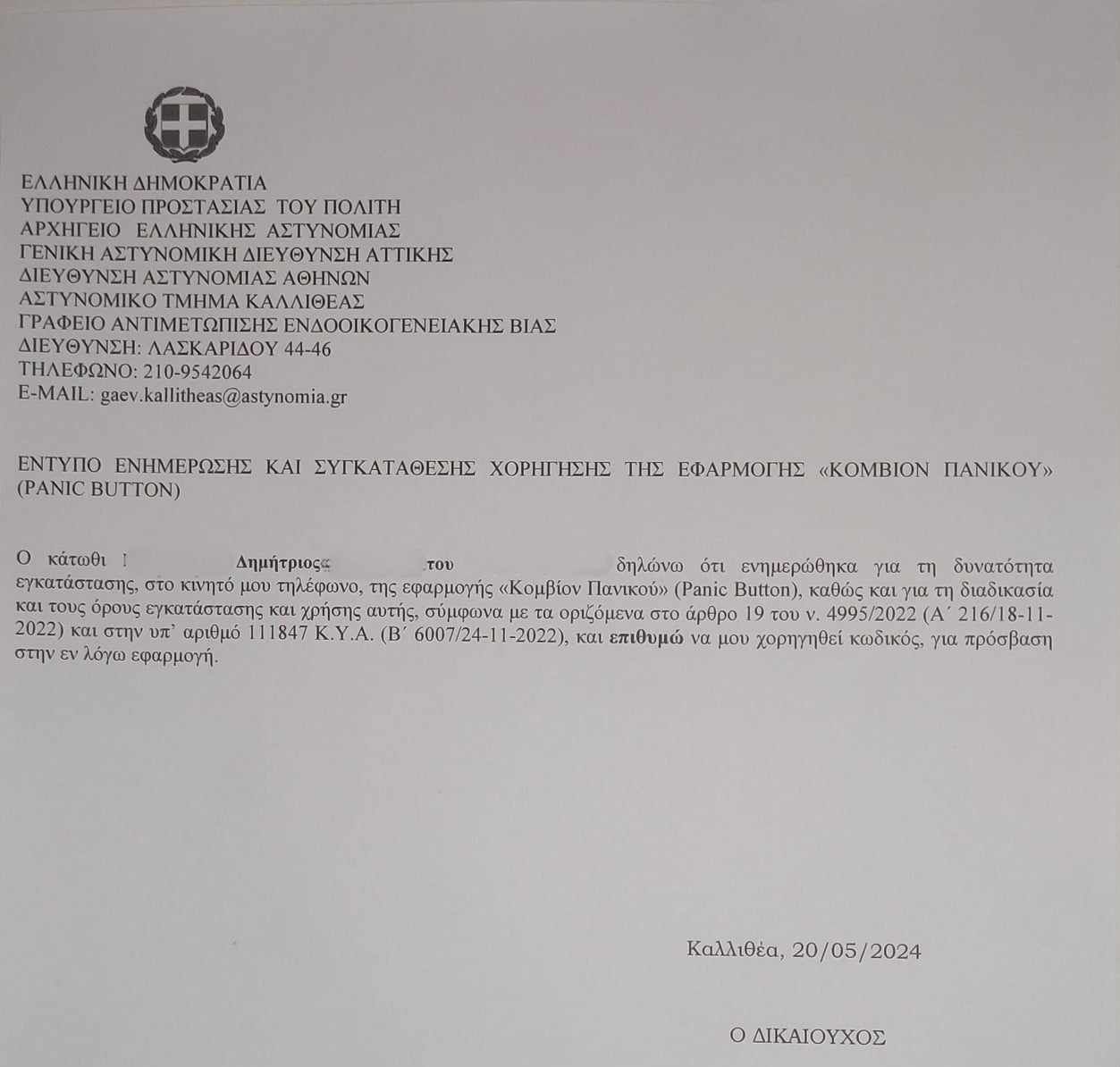 Το Panic Button είναι μία εφαρμογή που χορηγείται από τα Αστυνομικά Τμήματα και τα Συμβουλευτικά Κέντρα του Δικτύου Δομών της Γενικής Γραμματείας Ισότητας και Ανθρωπίνων Δικαιωμάτων του Υπουργείου Κοινωνικής Συνοχής και Οικογένειας.