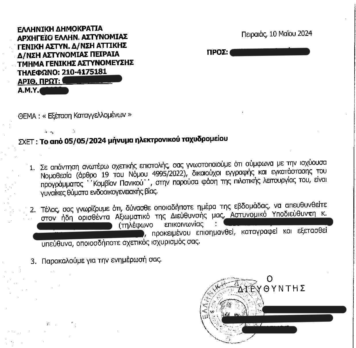 Στο Α.Τ. του νησιού κινήθηκε η διαδικασία του αυτοφώρου και ο πατέρας έντρομος για την σωματική του ακεραιότητα ζήτησε την προστασία από την αστυνομία η οποία με τις ενέργειες της δεν τους έφερε ξανά σε επαφή στο τμήμα ενώ παράλληλα αιτήθηκε να έχει πρόσβαση στην εφαρμογή PANIC BUTTON καθώς πολλάκις είχε απειληθεί η ζωή του από τα συγκεκριμένα άτομα και με το τελευταίο γεγονός που παραλίγο να γίνουν πράξη οι απειλές τους και μάλιστα μπροστά στα παιδιά του.