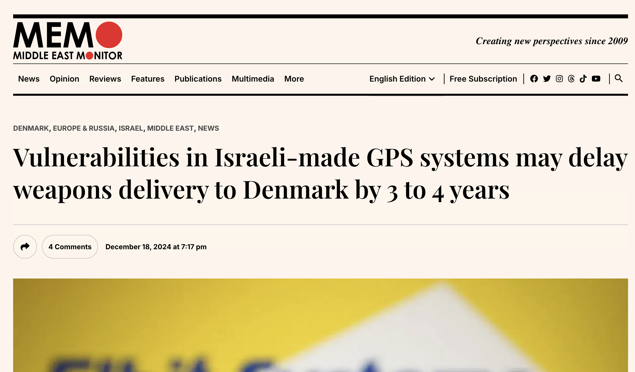 «Οι αμφιλεγόμενες παραδόσεις όπλων στην Δανία από την ισραηλινή στρατιωτική εταιρεία Elbit System, ενδέχεται να καθυστερήσουν για τρία έως τέσσερα χρόνια λόγω προβλημάτων με τη λειτουργία του GPS σε ζώνες μάχης, τα οποία η Κοπεγχάγη πιστεύει ότι είναι ευάλωτα σε εμπλοκή στα πεδία των μαχών και μπορεί να κοστίσουν περισσότερο» αναφέρεται στο δημοσίευμα.