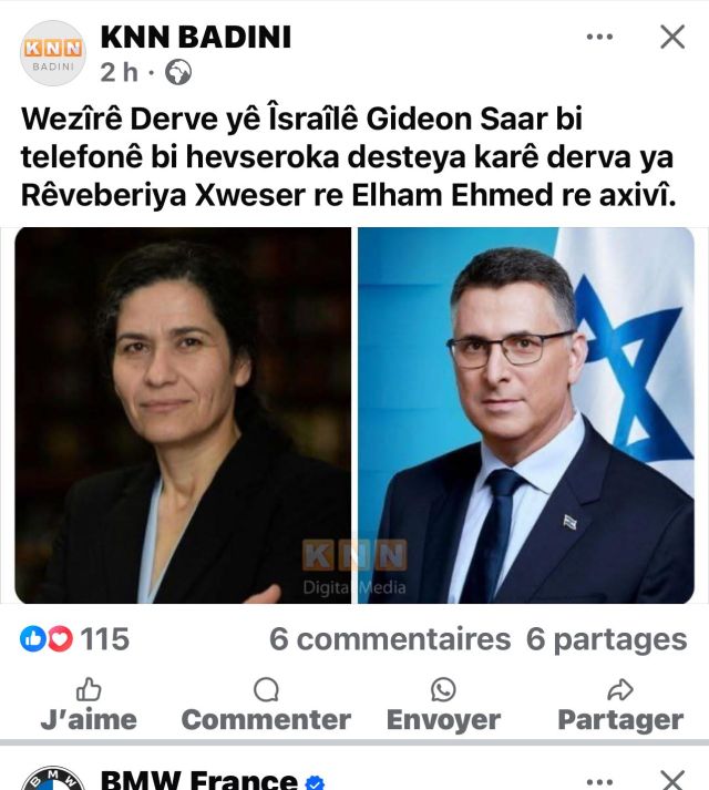 Ο Ισραηλινός υπουργός Εξωτερικών Γκίντεον Σαάρ είχε μια πρωτοποριακή τηλεφωνική επικοινωνία με την Ιλχάμ Αχμάντ, υπουργό Εξωτερικών της αυτόνομης Κουρδικής Περιοχής (Ροζάβα) στη βόρεια Συρία.