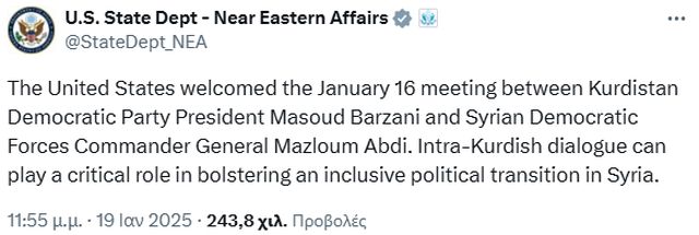 Το Υπουργείο Εξωτερικών των ΗΠΑ χαιρέτισε την πρόσφατη συνάντηση μεταξύ του Στρατηγού Μαζλούμ Άμπντι, Αρχηγού των Συριακών Δημοκρατικών Δυνάμεων (SDF), και του Μασούντ Μπαρζανί, Προέδρου του Δημοκρατικού Κόμματος του Κουρδιστάν (KDP) και πρώην Προέδρου της Περιφέρειας του Κουρδιστάν του Ιράκ (KRI).