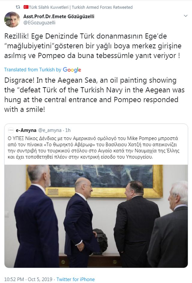 «Ρεζιλίκι!» γράφει. «Ένας πίνακας που δείχνει την καταστροφή του τουρκικού στόλου στο Αιγαίο έχει τοποθετηθεί στην κεντρική είσοδο (του υπουργείου Εξωτερικών) και ο Πομπέο αντέδρασε με ένα χαμόγελο!».